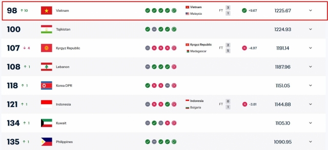 Sự cải thiện thứ hạng của ĐT Việt Nam trước đó xuất phát từ việc được cộng thêm điểm số liên quan đến trận gặp Malaysia ở lượt trận thứ hai bảng F, vòng loại Asian Cup 2027. Trước đó, Liên đoàn Bóng đá châu Á (AFC) đã xử thua đội tuyển Malaysia 0-3 ở cả hai trận gặp Nepal và Việt Nam vì vi phạm quy định về tư cách cầu thủ.