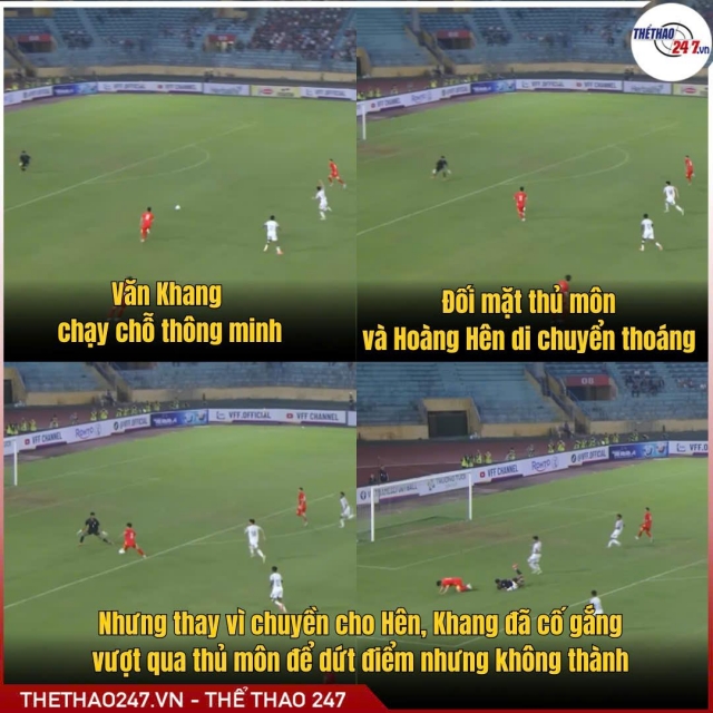 Trước đó, Văn Khang cũng là cái tên gây chú ý ở trận thắng Bangladesh, nhưng theo cách không mấy tích cực. Ở những phút cuối hiệp hai, tiền vệ sinh năm 2003 có pha bứt tốc bên cánh trái và đối mặt thủ môn đối phương. Trong tình huống này, anh hoàn toàn có thể dứt điểm hoặc chuyền bóng cho Hoàng Hên đang ở vị trí thuận lợi, nhưng lại xử lý thiếu chính xác, khiến cơ hội trôi qua đáng tiếc.