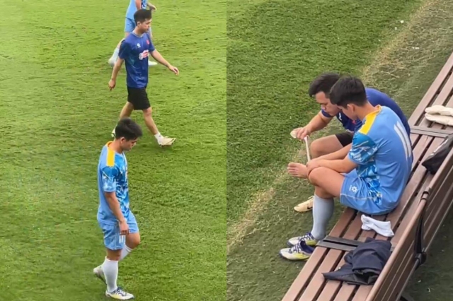 Cụ thể, trong buổi tập sáng 27/3, Văn Khang phải rời sân cùng bác sĩ đội tuyển. Hình ảnh ghi nhận cho thấy cầu thủ thuộc biên chế Thể Công Viettel ngồi ở khu vực ghế, trong khi bác sĩ tiến hành kiểm tra cổ chân trái.
